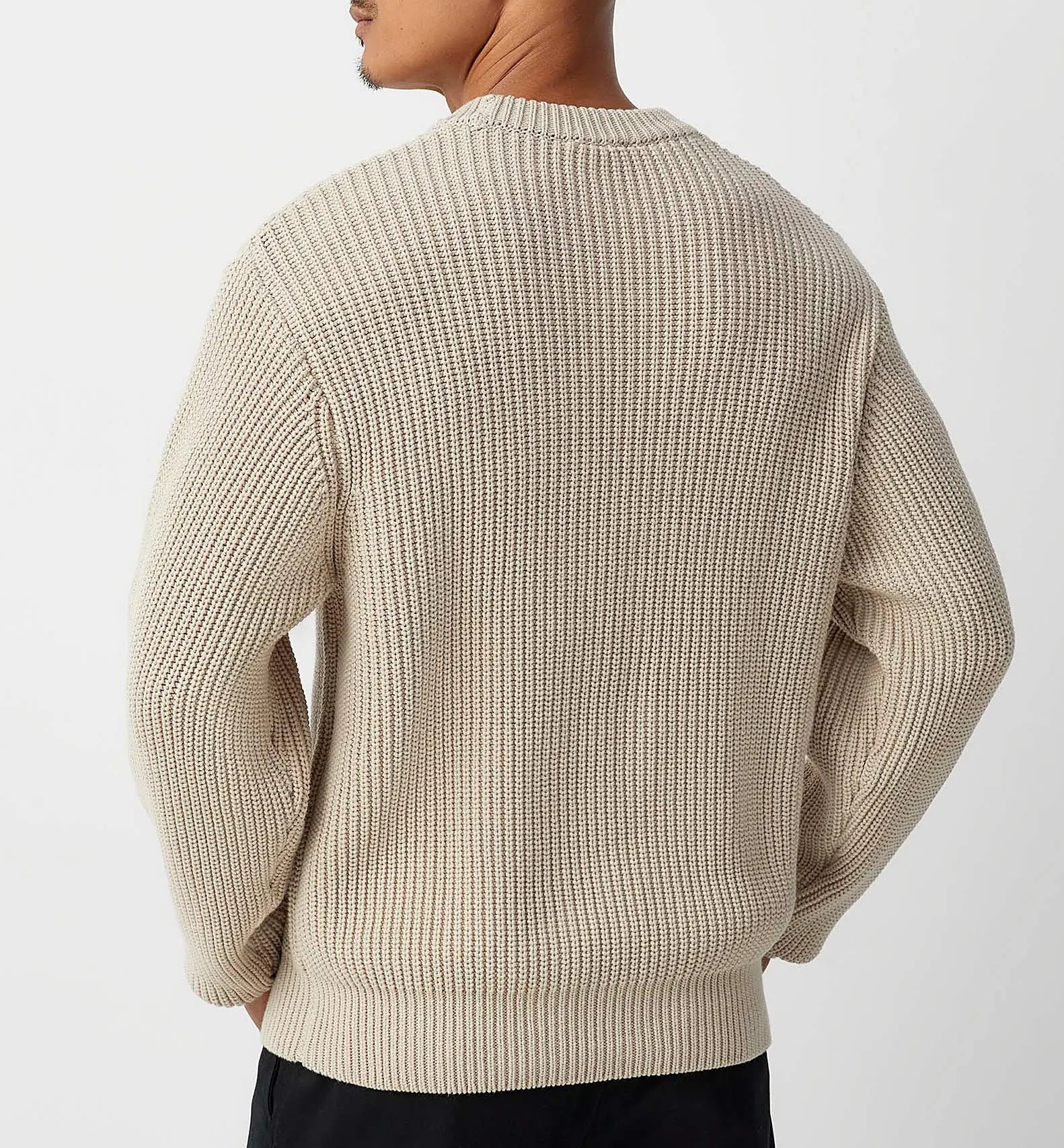 This pullover sweater is designed with a round neckline and long sleeves. The surface has a ribbed knit texture throughout, creating a structured look. The cuffs, hem, and neckline are finished with a tighter knit, which helps maintain the shape over time. The design allows the sweater to be worn on its own or layered with other pieces, making it suitable for a variety of everyday settings.
